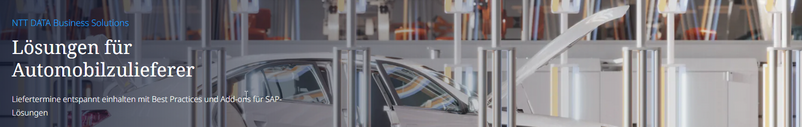 Wir von NTT DATA Business Solutions unterstützen Sie bei der Prozessoptimierung über die gesamte Wertschöpfungskette. Mit branchenüblichen Standardprozessen heben Sie Ihre Prozess- sowie Produktqualität und senken die Risiken. Entdecken Sie auf dieser Seite SAP Lösungen, SAP Add-Ons und kostenlose Inhalte für Automobilzulieferer. Bilden Sie die Grundlage für die Ihre digitale Transformation.